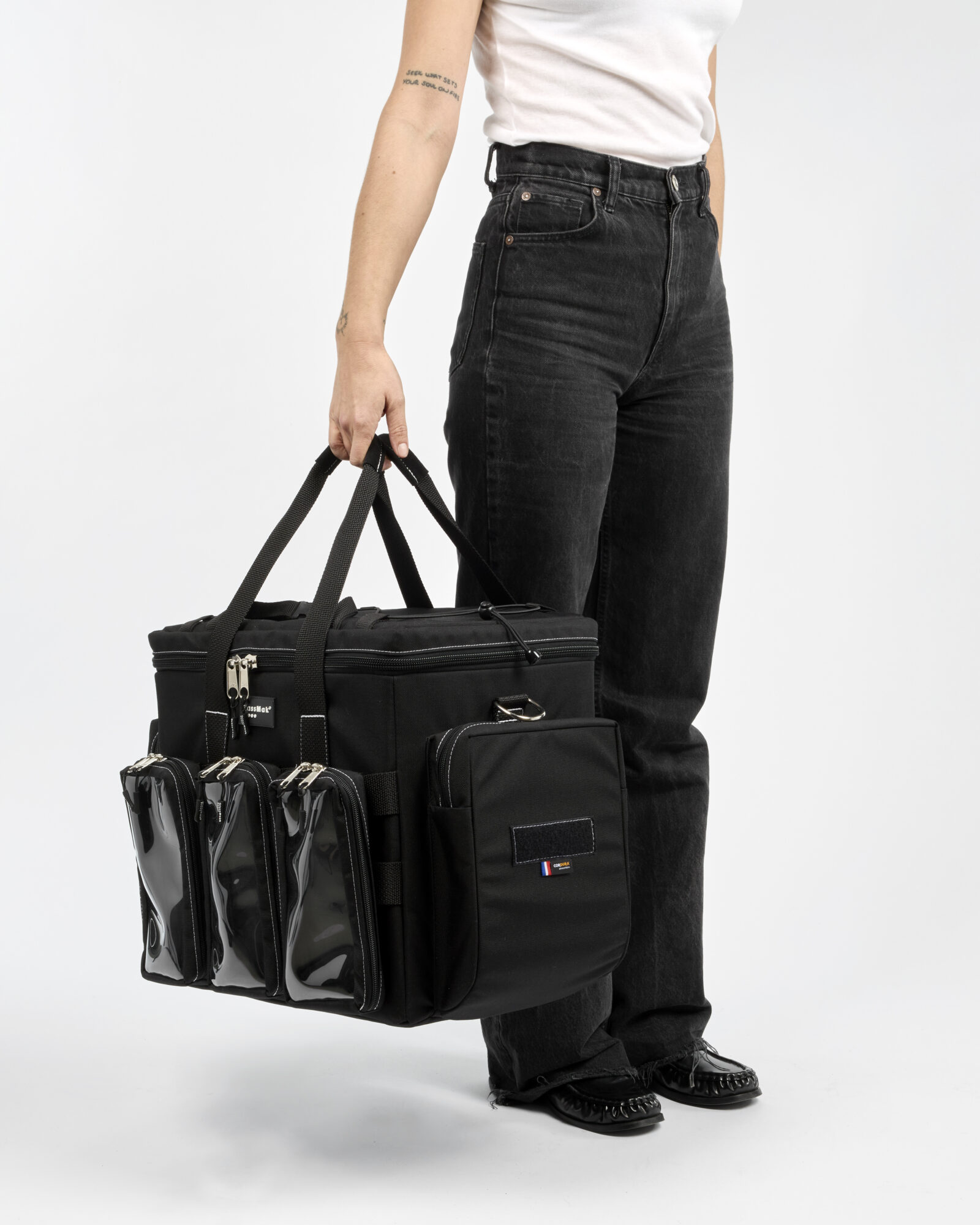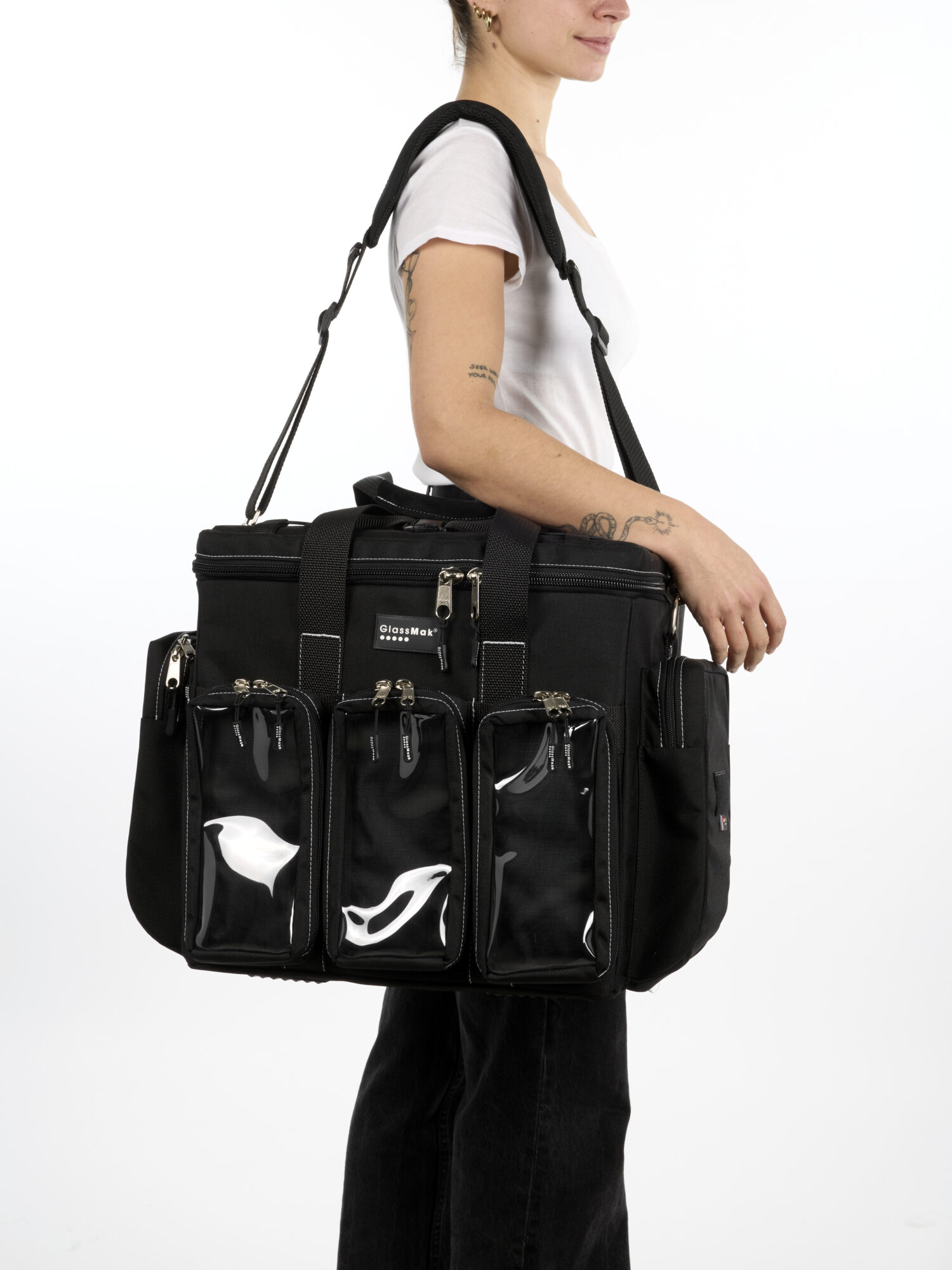 Il dispose de nombreuses poches internes et externes, de séparateurs ajustables, ainsi que de trois pochettes transparentes amovibles pour un rangement sur mesure.