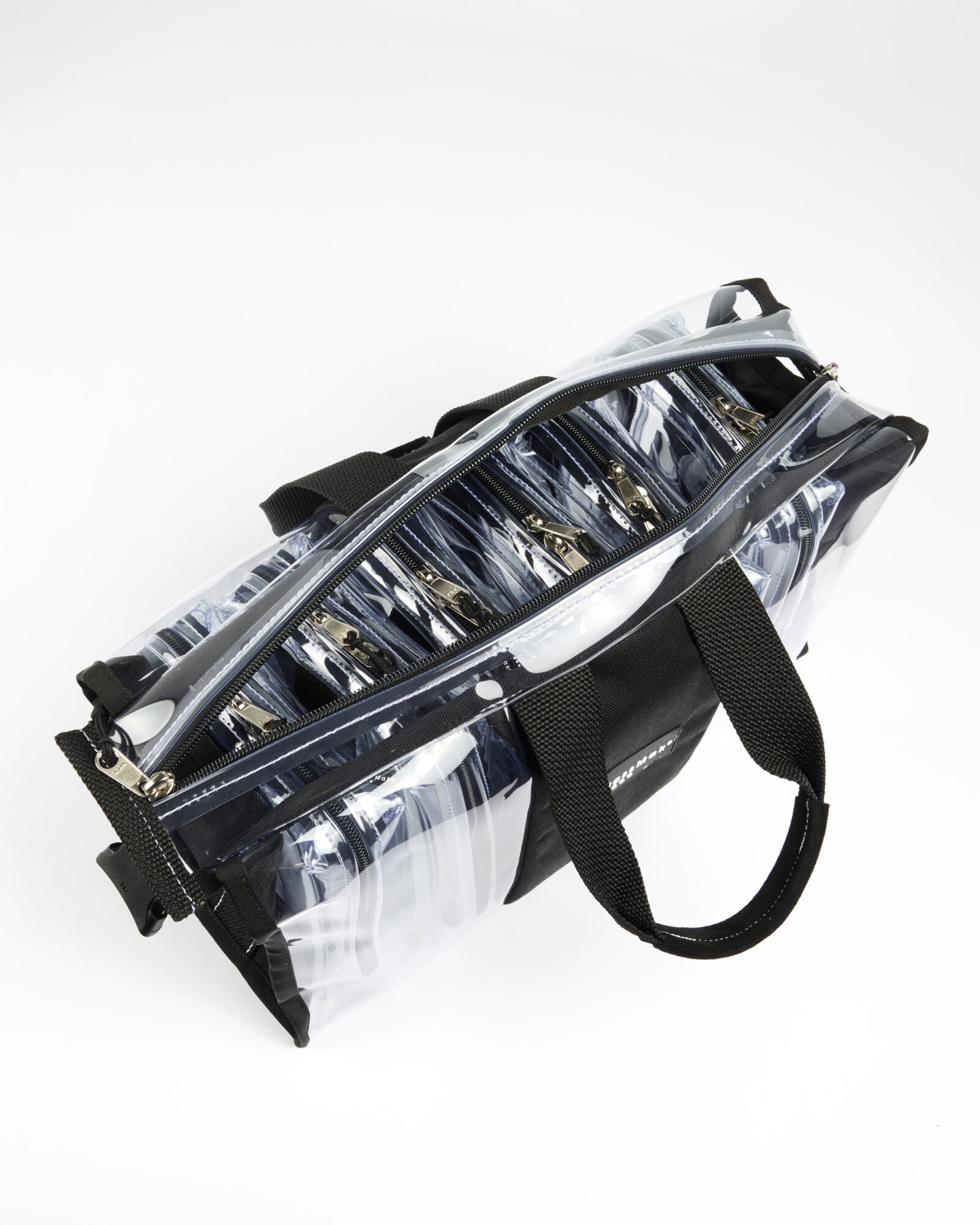 Sac avec 1 compartiment principal et 6 trousses transparentes.