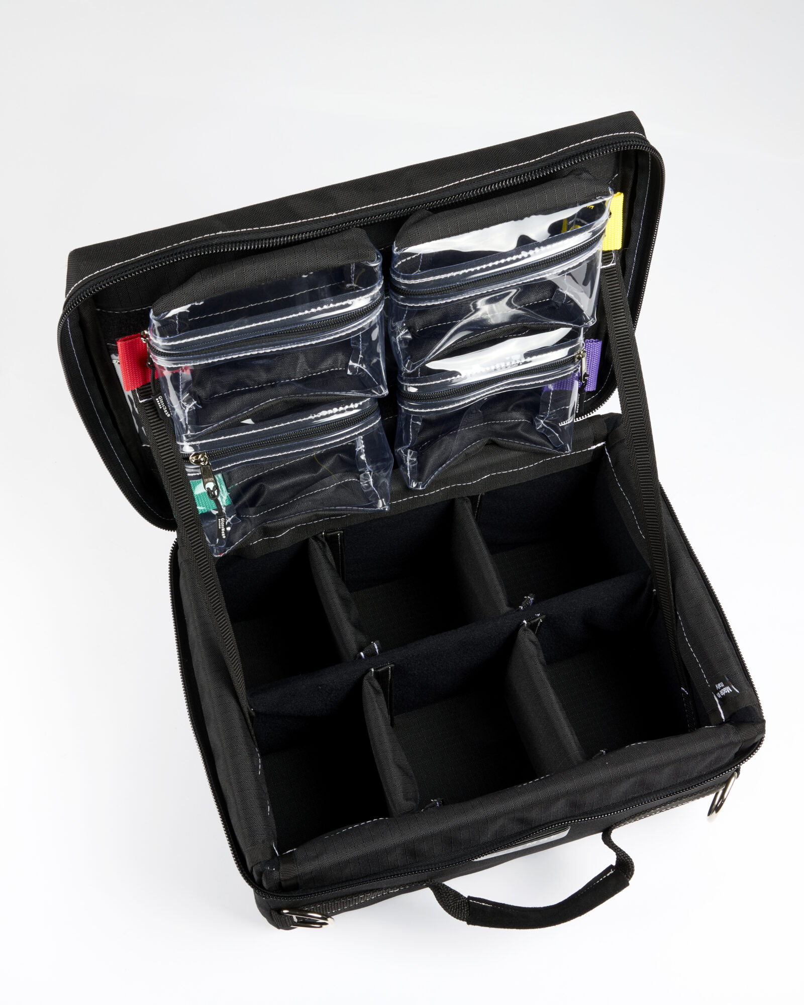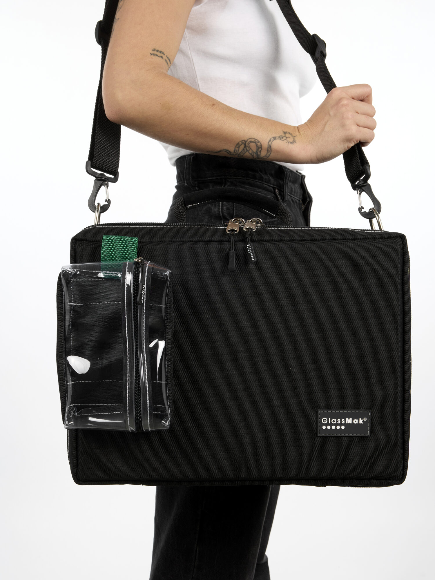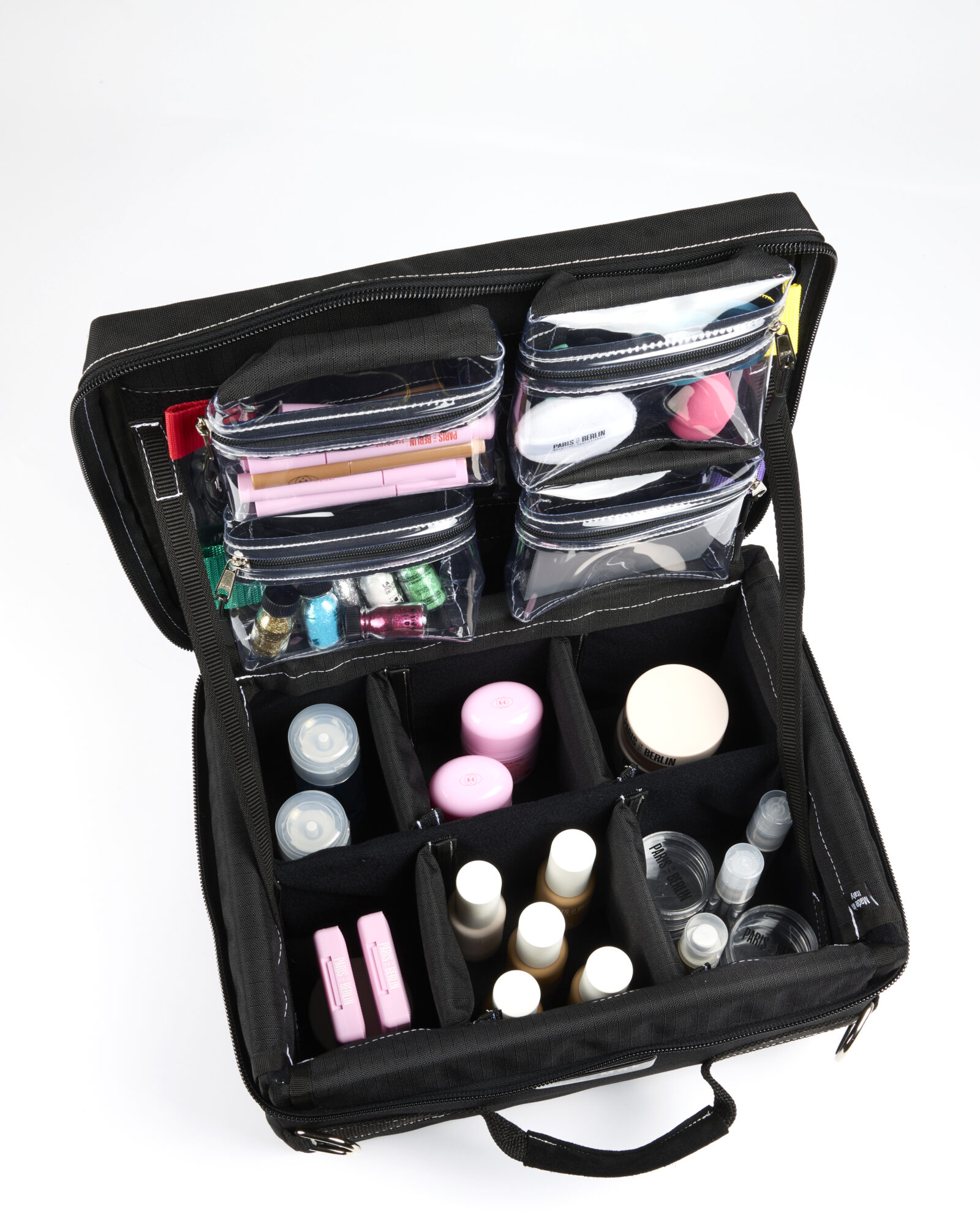 Elle intègre trois compartiments internes ainsi que deux pochettes transparentes amovibles, pensées pour un rangement clair et accessible.